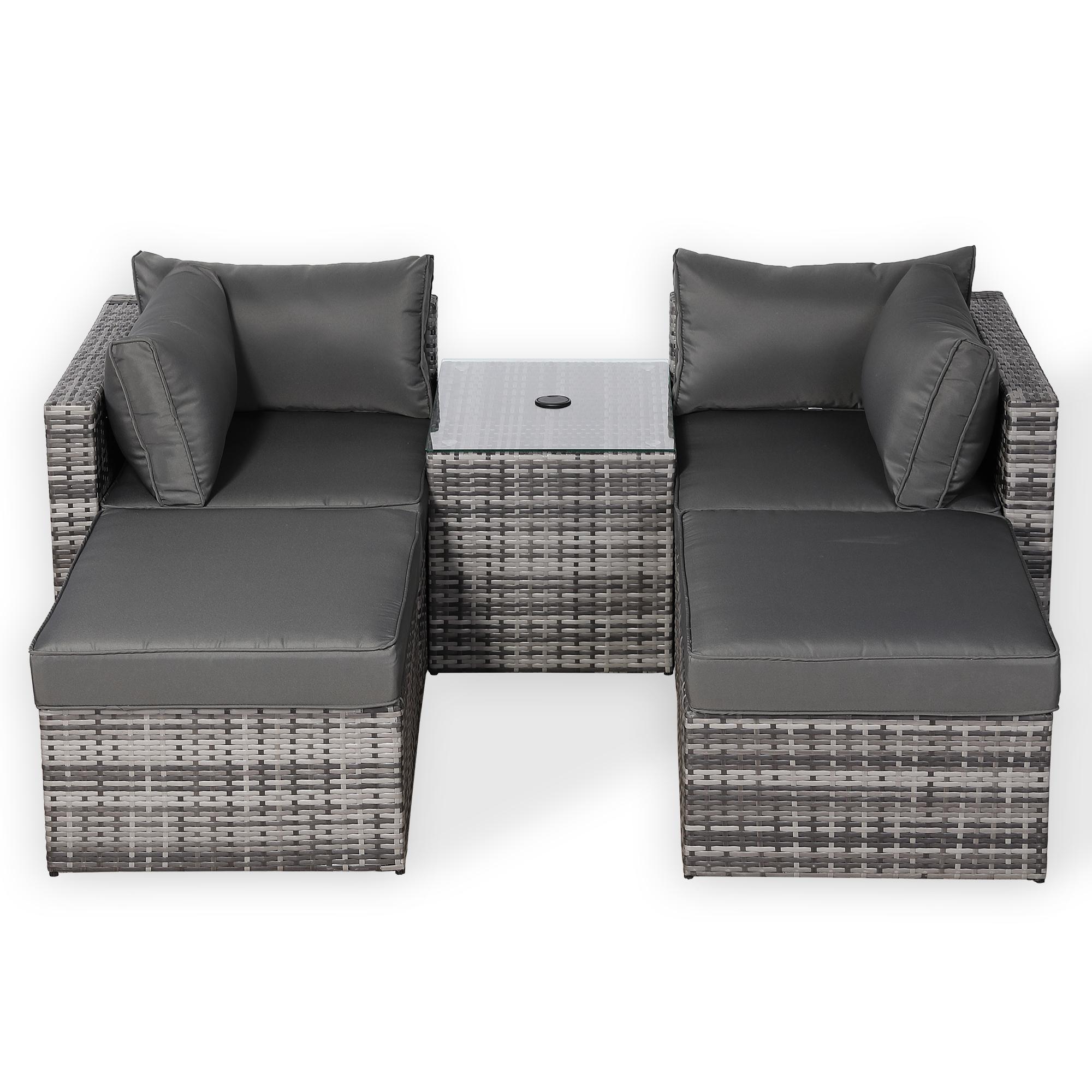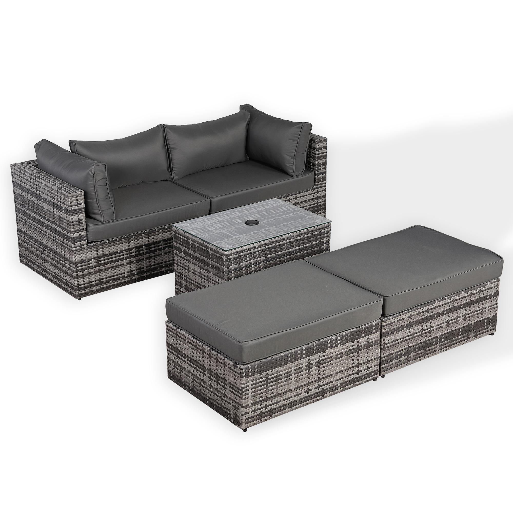 | This set includes | • Two Corner pieces come with comfy cushions • One side table with 5mm tempered glass top and parasol hole • 2 Benches with comfortable cushions |