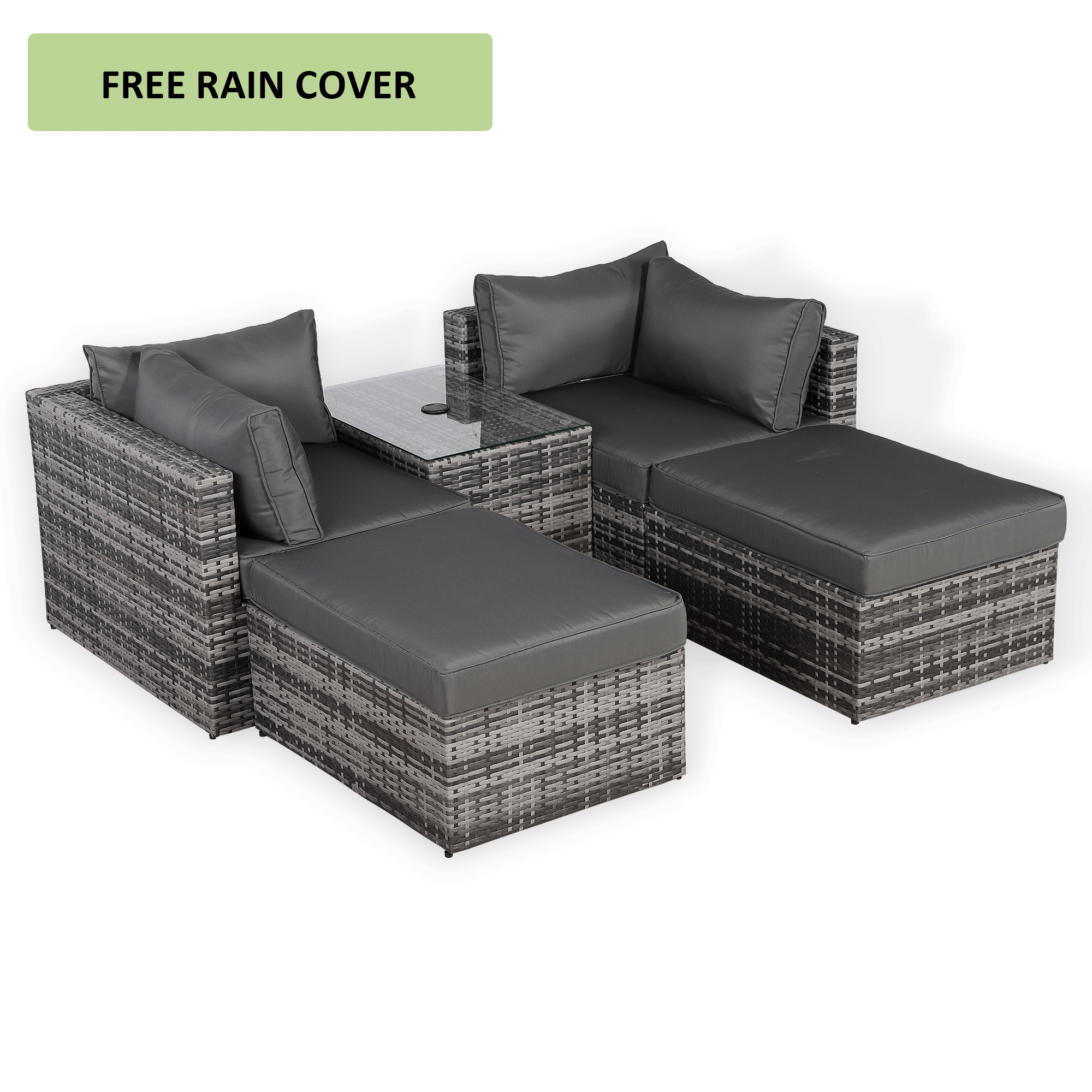 This compact lounger chaise sofa with side table and 2 benches fits in most gardens and has straight lines. The premium grey rattan gives it a modern look and it is super comfortable too! The galvanised steel frame will withstand our British weather of rain, wind and sun.